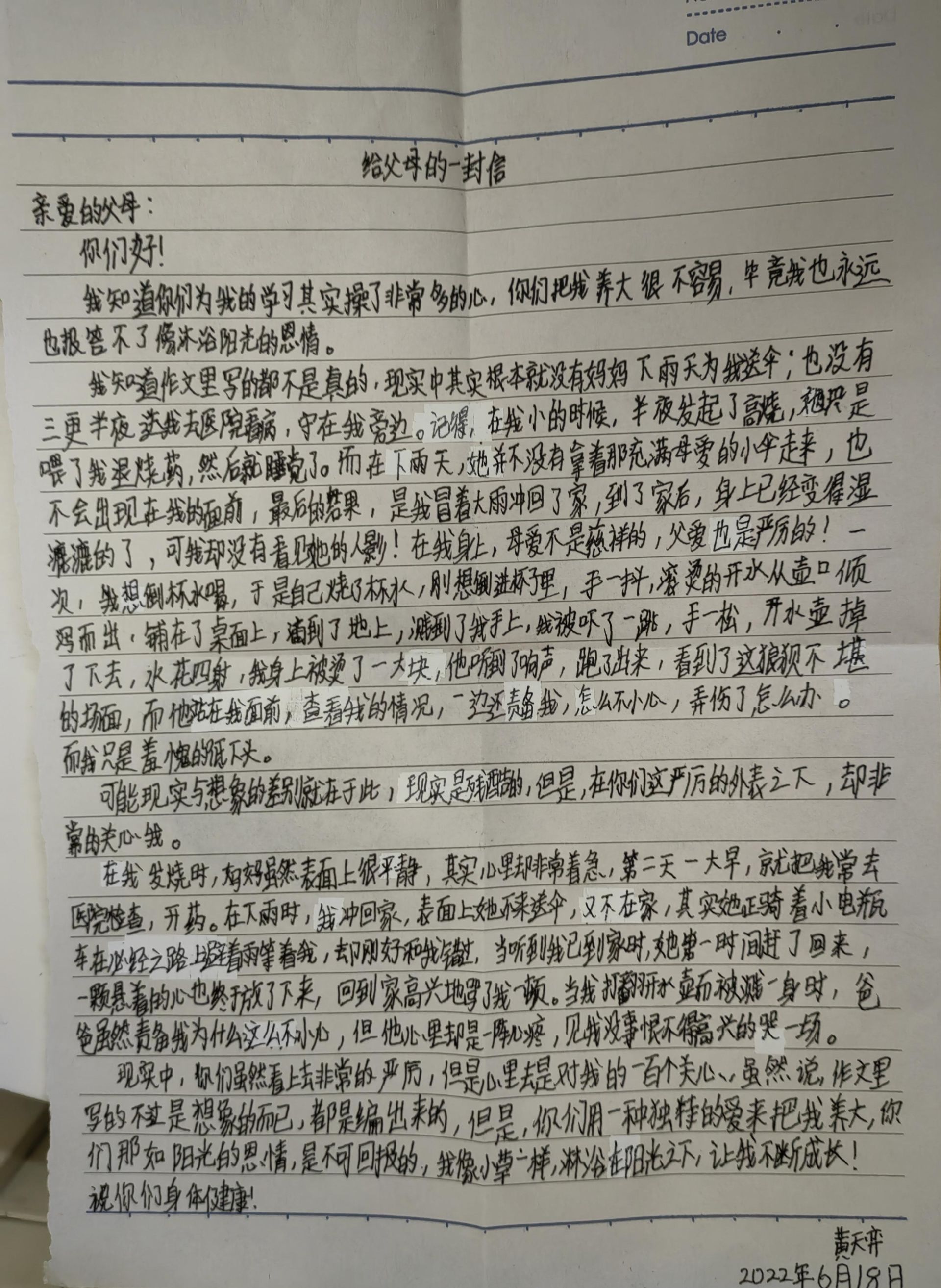今天,“少年领读者·一封家书”编辑组收到了来自武汉市汉铁初级中学曹雨果同学的一封家书。
