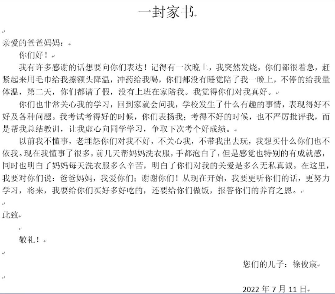 今天,“少年领读者·一封家书”编辑组收到了来自武汉市江夏区大花岭小学徐俊宸的一封家书。