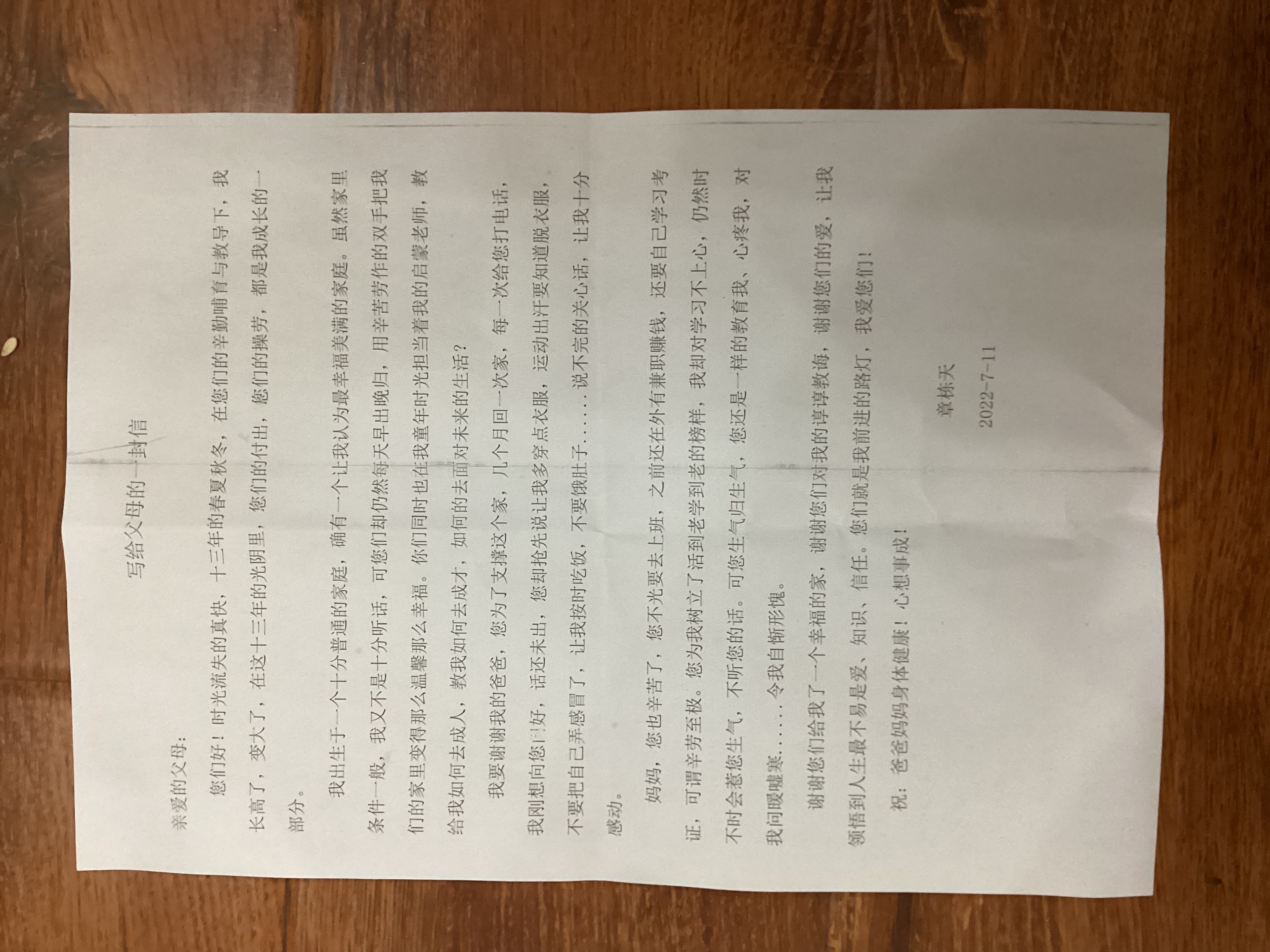 今天,“少年领读者·一封家书”编辑组收到了来自武汉市汉铁初级中学章栋天的一封家书。