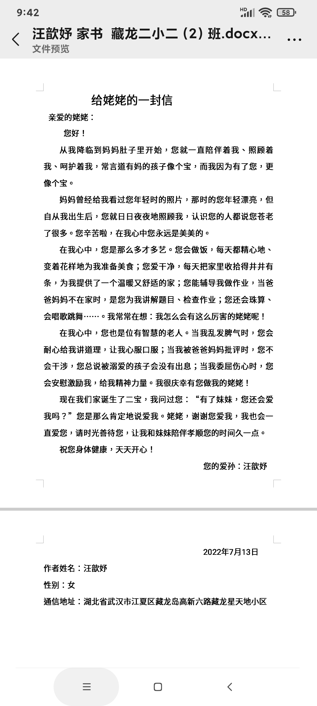 今天,“少年领读者·一封家书”编辑组收到了来自武汉市江夏区藏龙第二小学汪歆妤的一封家书。
