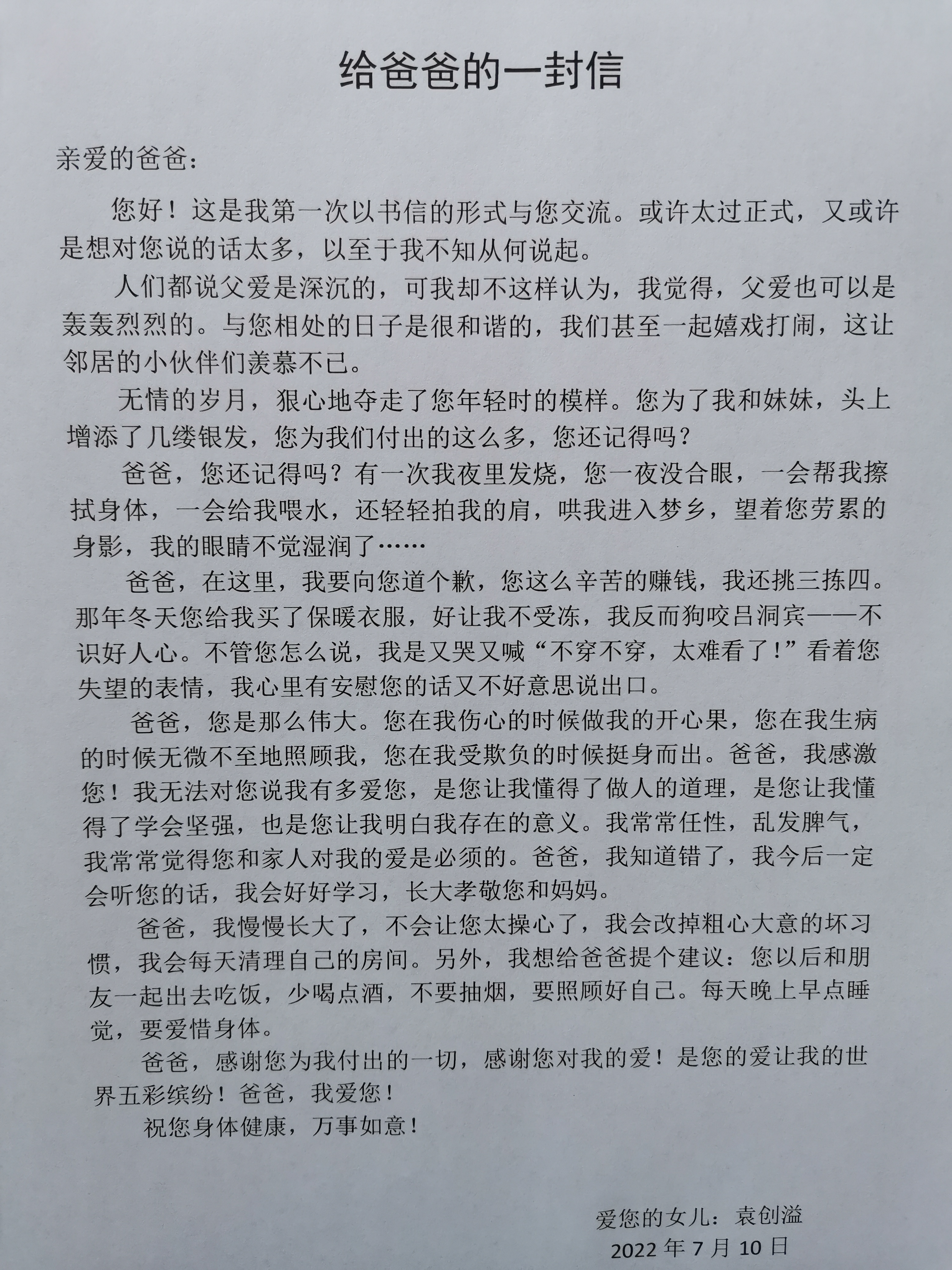 今天,“少年领读者·一封家书”编辑组收到了来自武汉市新洲区邾城街中心小学袁创溢的一封家书。