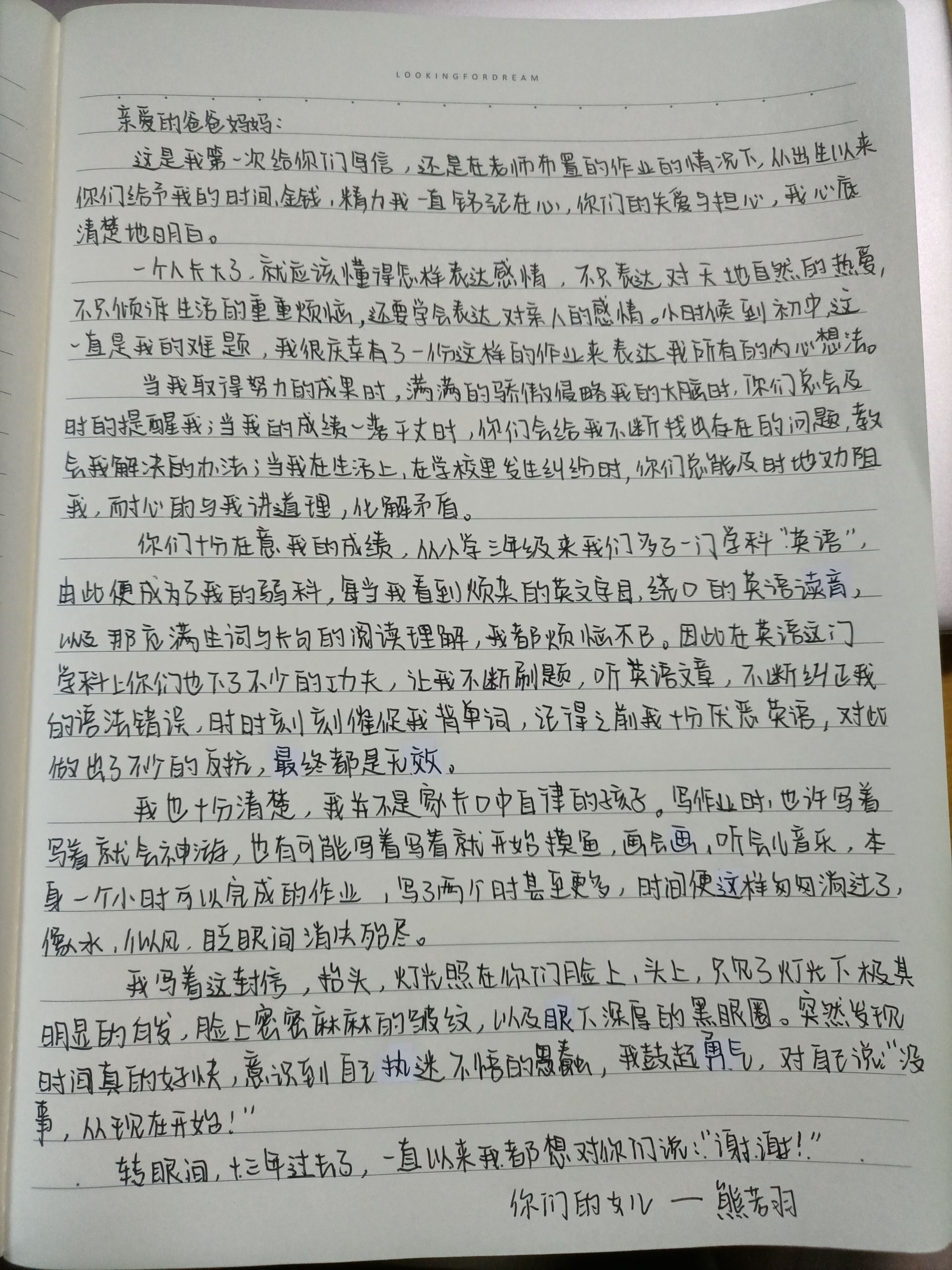 今天,“少年领读者·一封家书”编辑组收到了来自武汉市汉铁初级中学熊若羽同学写给父母的一封家书。