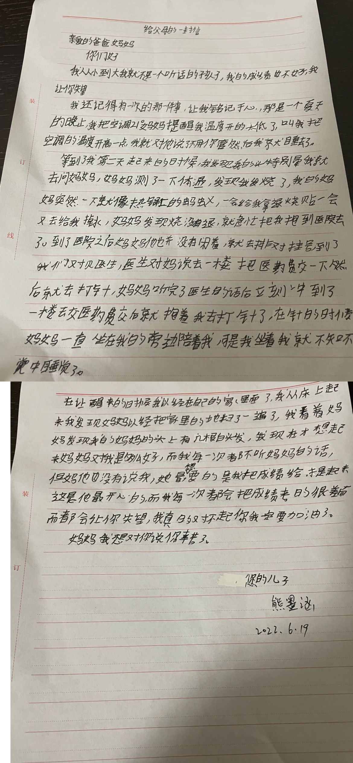今天,“少年领读者·一封家书”编辑组收到了来自汉铁初级中学熊墨涵同学给父母的一封家书。