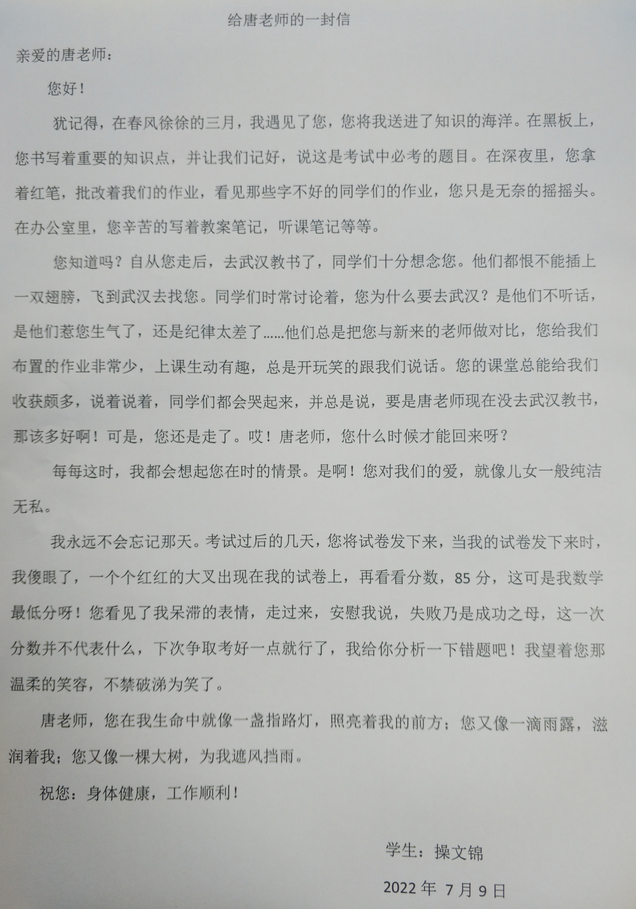 今天,“少年领读者·一封家书”编辑组收到了来自武汉市新洲区邾城街中心小学操文锦同学致唐老师的一封信。