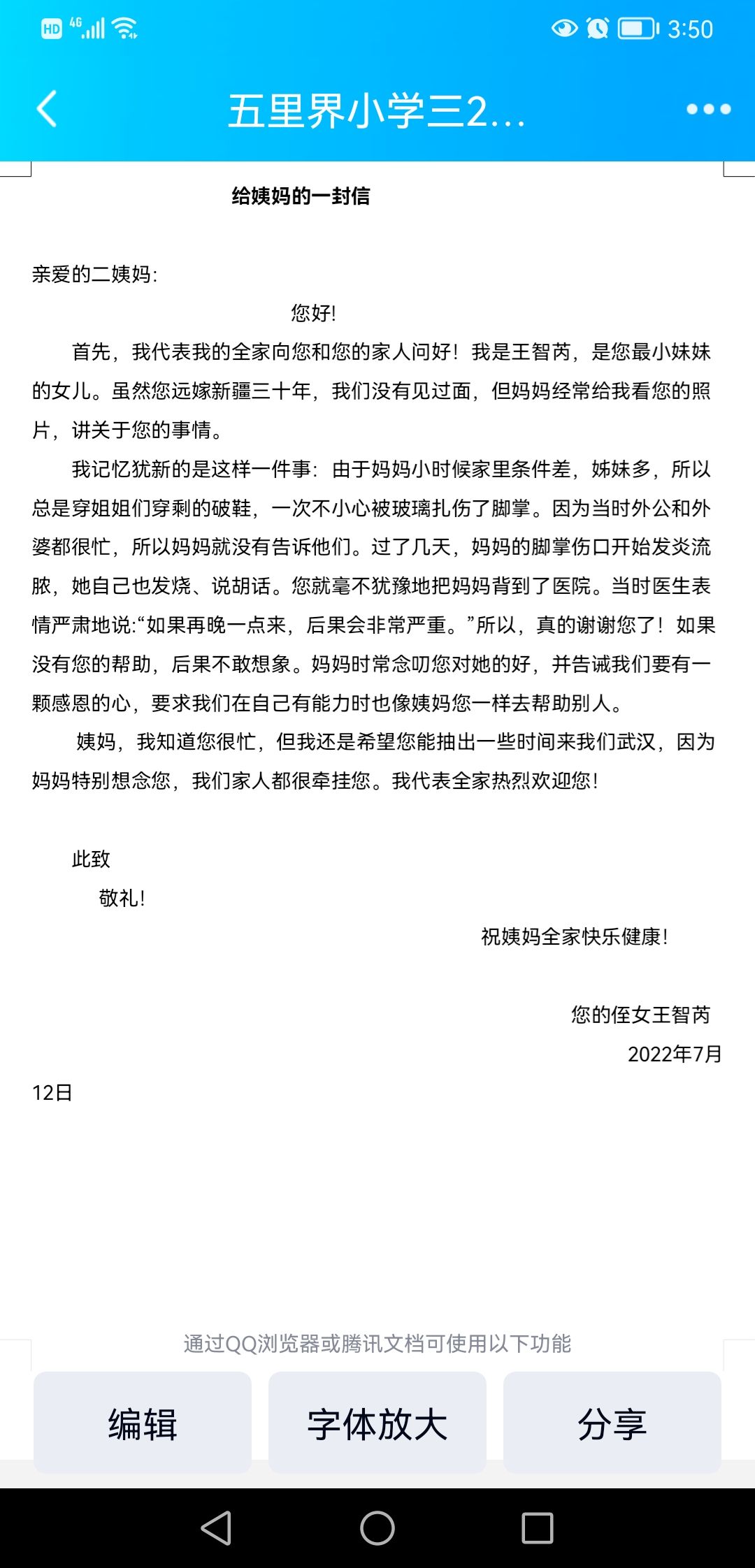 今天,“少年领读者·一封家书”编辑组收到了来自武汉市江夏区五里界小学王智苪同学写给姨妈的一封信。