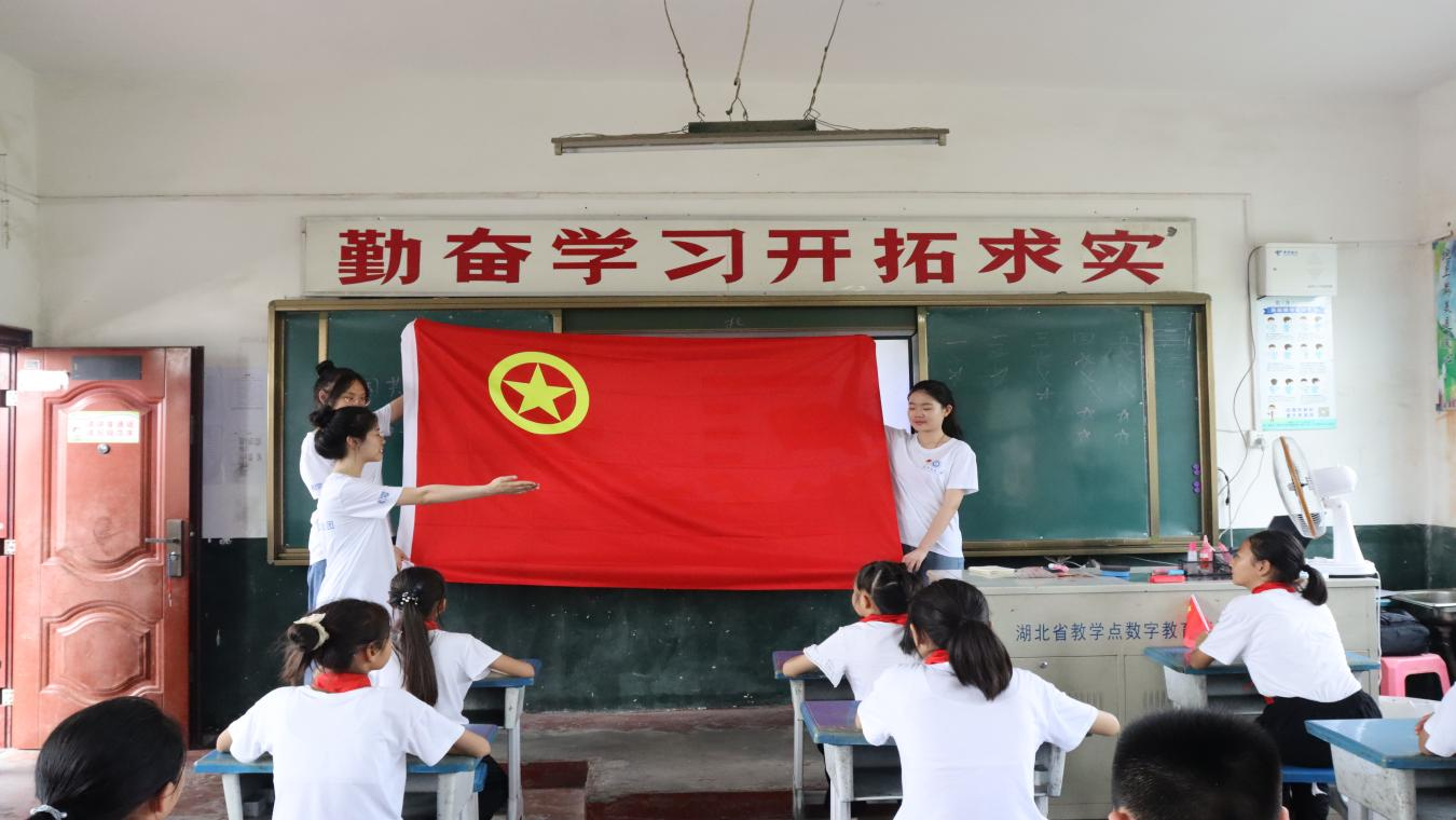志存高远方能登高望远,胸怀天下才可大展宏图。火热的青春,需要坚定的理想信念。“织梦”实践团在南漳县九集镇吴集中心小学,给孩子们带来了一场别开生面的沉浸式党史教育活动。一堂“奏好入队、入团、入党人生三部曲”主题教育课程,一次“童心向党 我来说团”创意拼贴手工活动,一场“心连心”文化体育用具捐赠仪式,把党的科学理论注入课堂,用队、团、党的光辉旗帜指引青年,将武汉纺织大学的爱传递给乡村儿童。