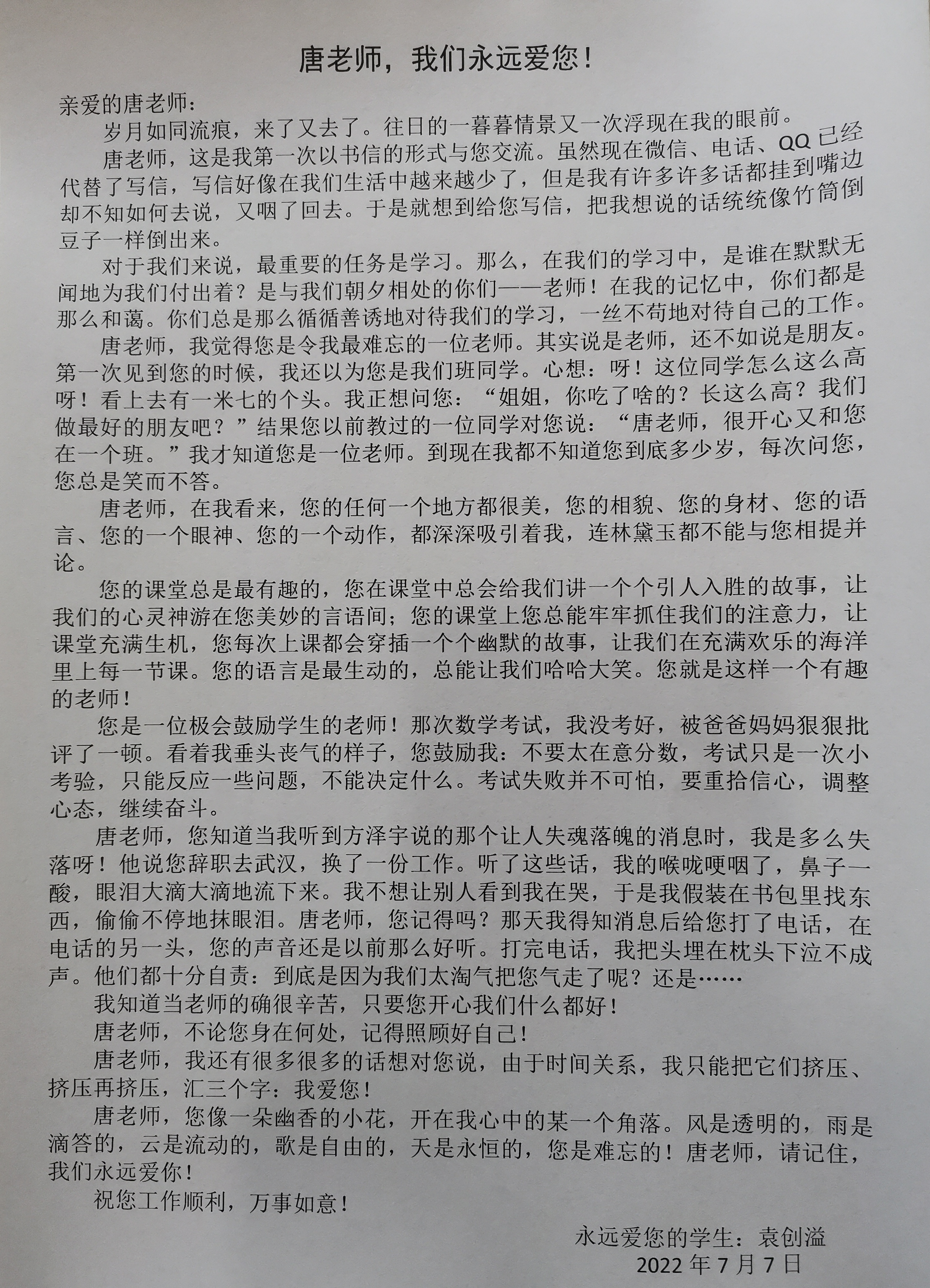 今天,“少年领读者·一封家书”编辑组收到了来自武汉市新洲区邾城街中心小学袁创溢同学写给老师的一封信。