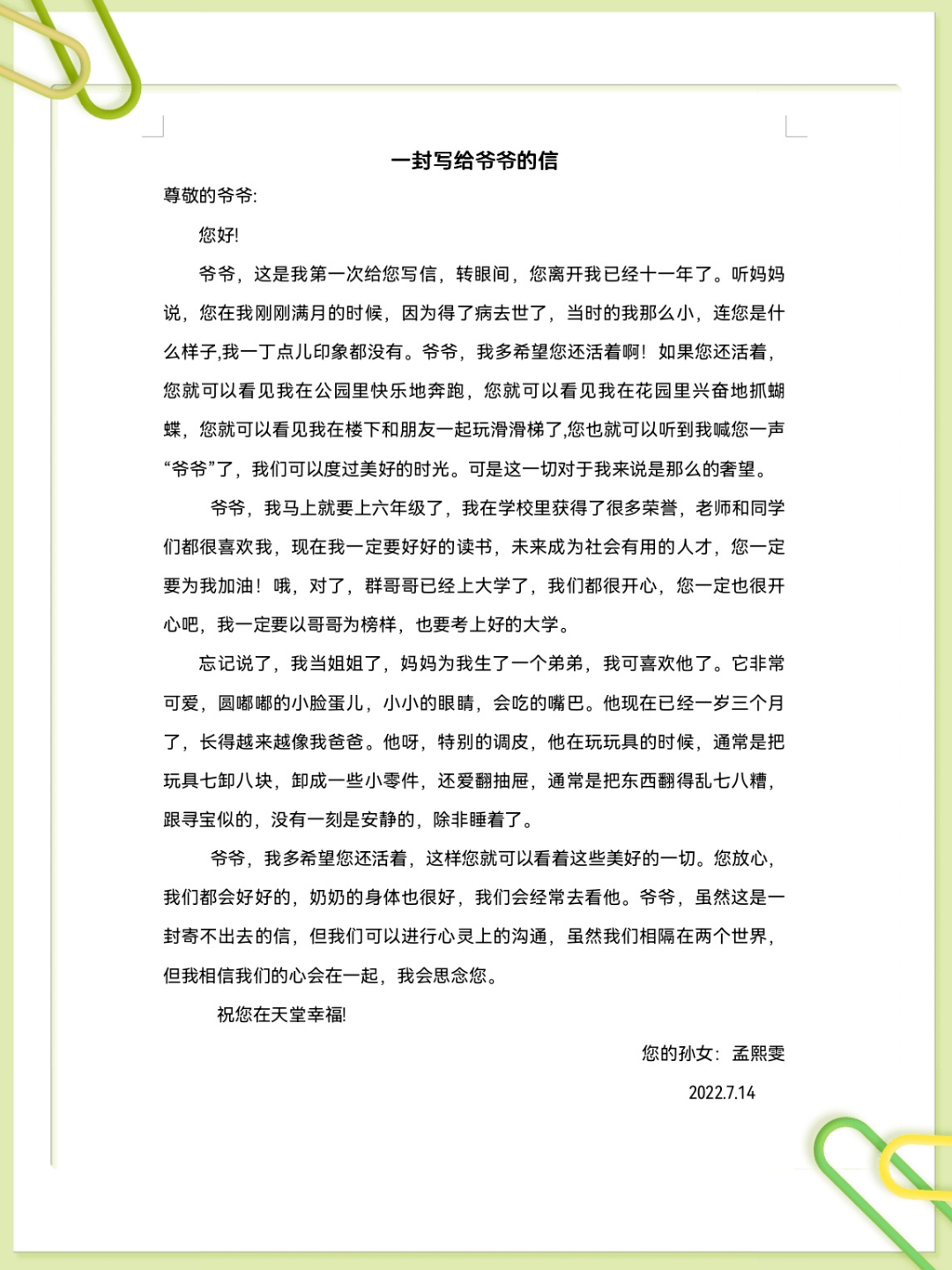 今天,“少年领读者·一封家书”编辑组收到了来自武汉市东西湖区吴家山第四小学孟熙雯同学写给爷爷的信。