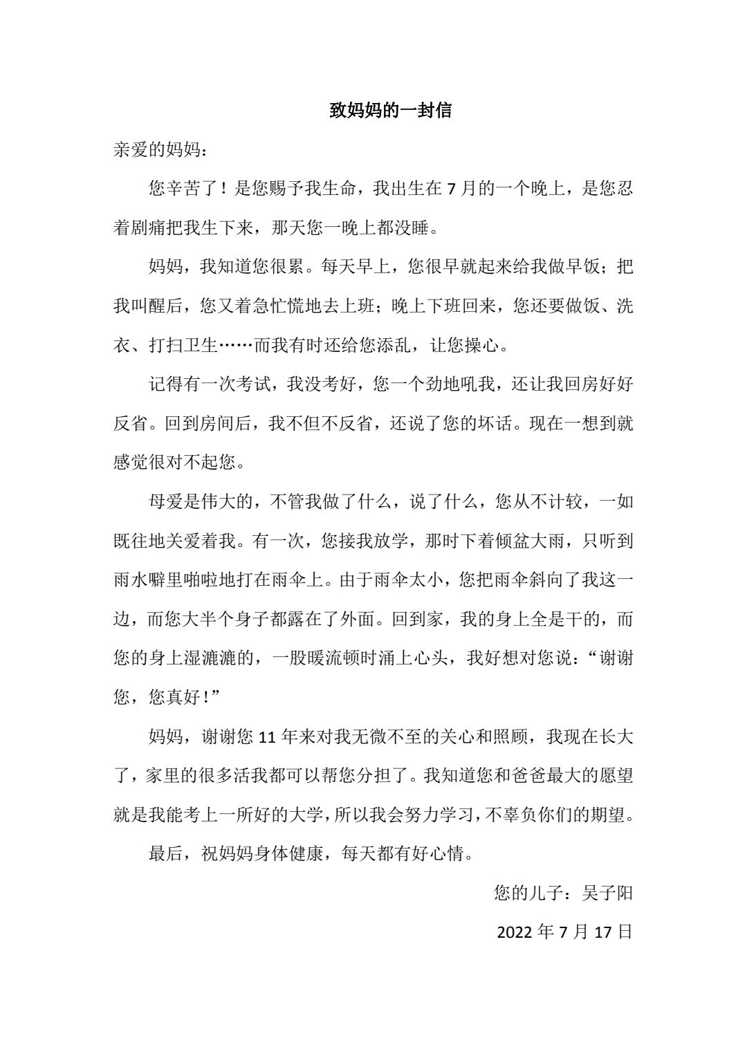 今天,“少年领读者·一封家书”编辑组收到了来自武汉市金口街范湖小学吴子阳同学写给妈妈的信。