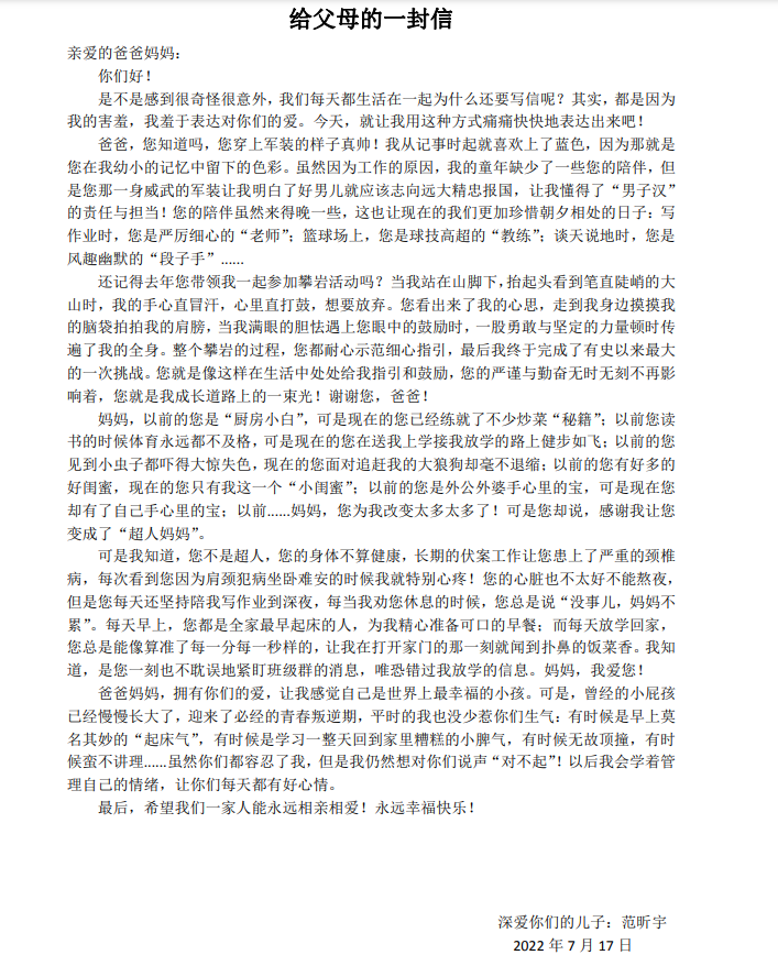 今天,“少年领读者·一封家书”编辑组收到了来自武汉市汉铁初级中学范昕宇同学写给爸妈的信。