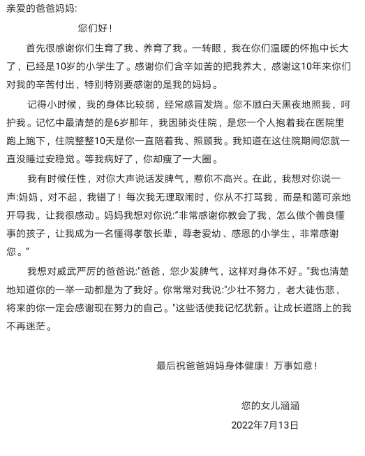 今天,“少年领读者·一封家书”编辑组收到了来自武汉市五里界小学张育涵同学写给爸爸妈妈的一封信。