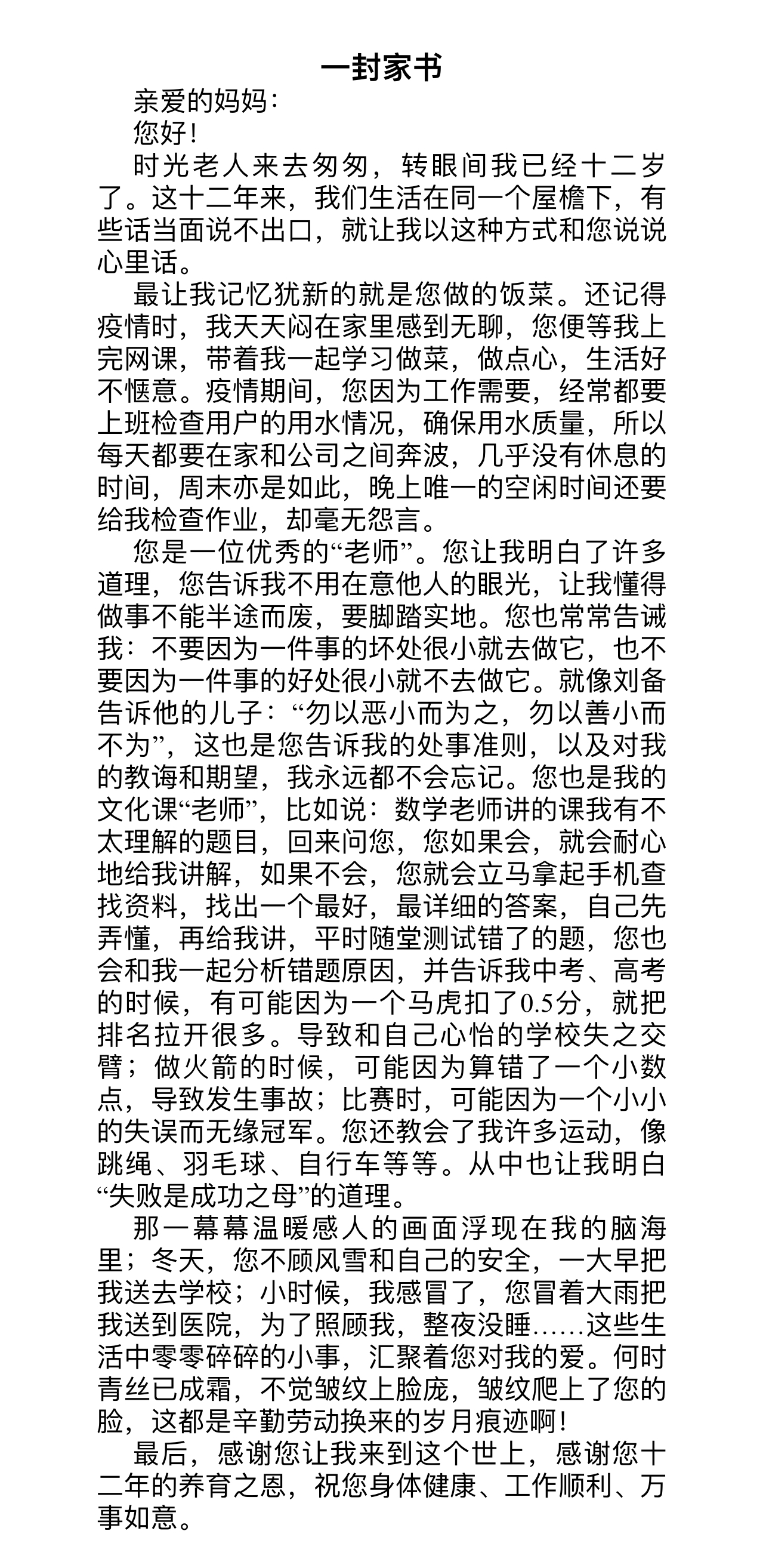 今天,“少年领读者·一封家书”编辑组收到了来自武汉市新洲区邾城街中心小学毛诗颖同学写给妈妈的一封信。