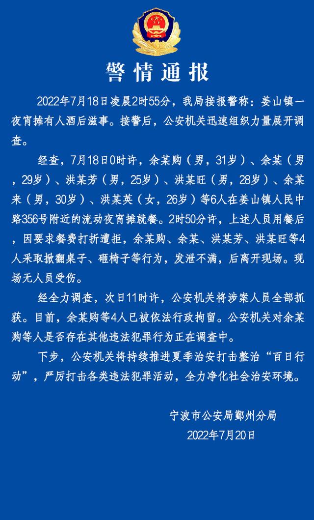 宁波市公安局鄞州分局官方微博通报,经查,7月18日0时许,余某购(男,31岁)、余某(男,29岁)、洪某芳(男,25岁)、洪某旺(男,28岁)、余某来(男,30岁)、洪某英(女,26岁)等6人在姜山镇人民中路356号附近的流动夜宵推就餐。2时50分许,上述人员用餐后,因要求餐费打折遭拒,余某购、余某、洪某芳、洪某旺等4人采取掀翻桌子、砸椅子等行为,发泄不满,后离开现场。现场无人员受伤。