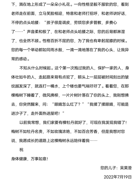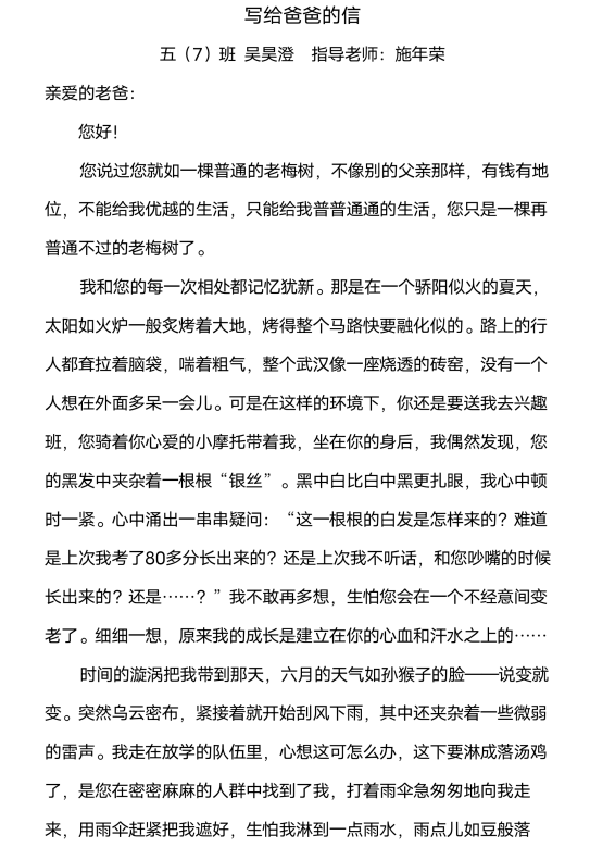 今天,“少年领读者·一封家书”编辑组收到了来自武汉市新洲区邾城街中心小学吴昊澄同学写给爸爸的一封信。