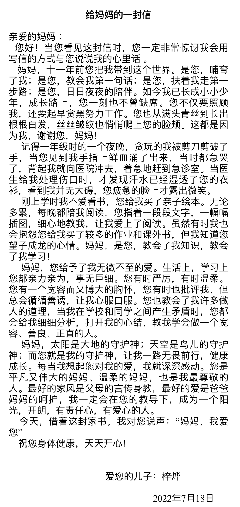 今天,“少年领读者·一封家书”编辑组收到了来自武汉市江夏区实验小学熊廷弼校区五(1)班曾梓烨同学写给妈妈的一封信。
