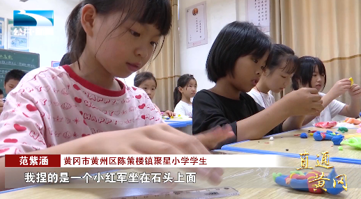 黄冈市黄州区陈策楼镇聚星小学学生 范紫涵:“我捏的是一个小红军坐在石头上面,以前在家里面是随性捏的,在学校有更多的图案 更多的图形、更丰富了。”