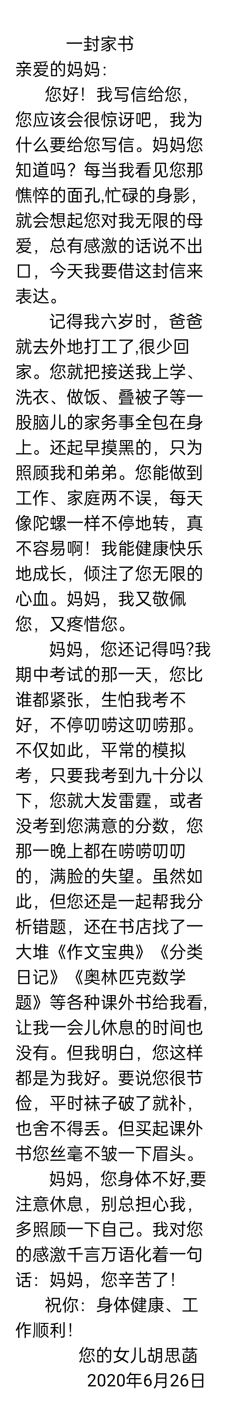 今天,“少年领读者·一封家书”编辑组收到了来自武汉市新洲区邾城街第六小学胡思菡同学写给妈妈的一封信。