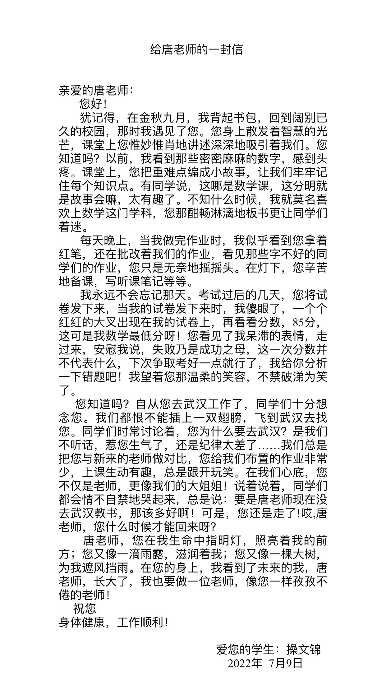 今天,“少年领读者·一封家书”编辑组收到了来自武汉市新洲区邾城街中心小学操文锦同学写给唐老师的一封信。