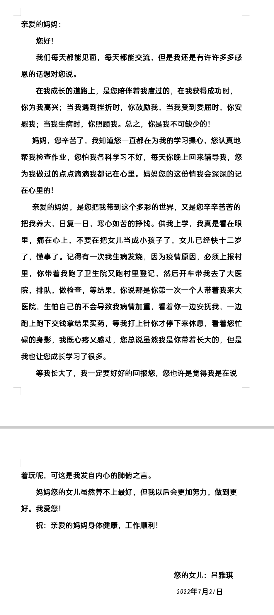 今天,“少年领读者·一封家书”编辑组收到了来自武汉市江夏区金口小学吕雅琪同学写给妈妈的一封信。