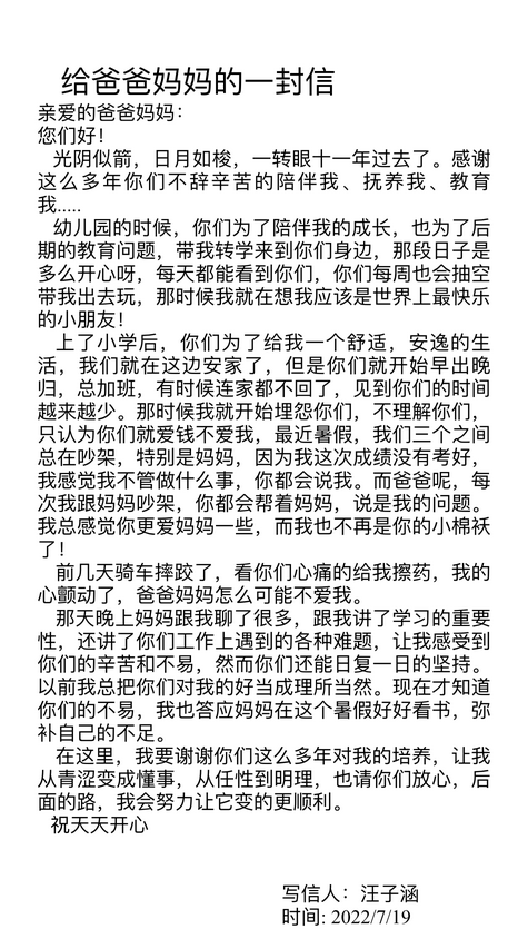 今天,“少年领读者·一封家书”编辑组收到了来自武汉市藏龙小学汪子涵同学写给爸爸妈妈的一封信。