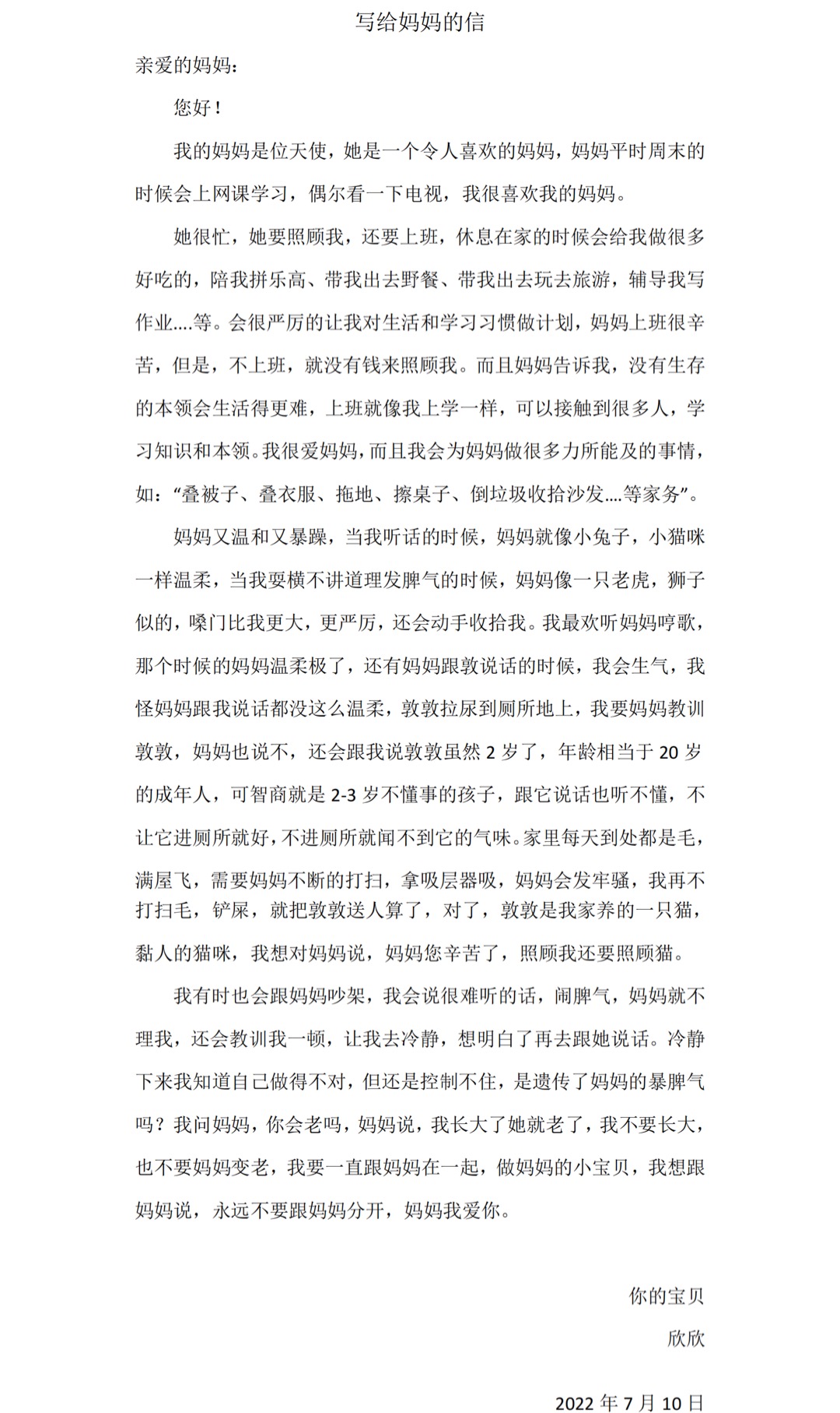 今天,“少年领读者·一封家书”编辑组收到了来自武汉市江夏区实验小学体育馆校区王雨欣同学写给妈妈的一封信。