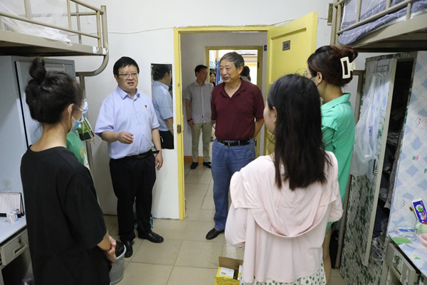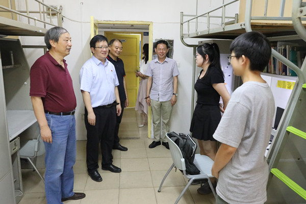 在西9-207宿舍,路海华向同学们介绍,“我是学校新任的党委书记,今天是上班第一天,得知不少同学暑期留校学习,特地来看望大家。”他叮嘱同学们在紧张的学习之余,做好防暑降温,注意安全。“感谢校领导们的关心,我们一定好好学习。”同学们回答。