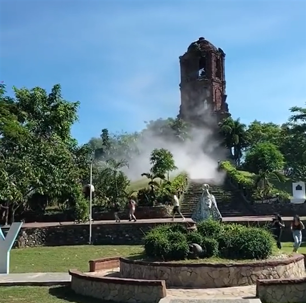 从现场实拍的视频来看,强震造成当地部分地区地面开裂,民众逃往空旷地带躲避,在班塔延岛著名钟楼出现部分坍塌。