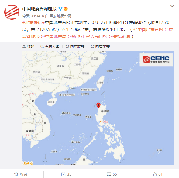 北京时间7月27日,据中国地震台网速报,今日8时43分在菲律宾(北纬17.70度,东经120.55度)发生7.0级地震,震源深度10千米,震中在吕宋岛阿布拉省的拉甘吉朗。