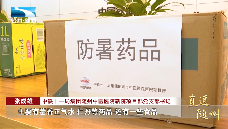 中铁十一局集团随州中医医院新院项目部党支部书记 张成雄:“发放了防暑降温药品及食品,主要有藿香正气水,仁丹等药品,还有一些食品,比如说绿豆、白糖、西瓜,每天为农民工兄弟熬了绿豆汤供大家使用,还有一些茶水等方面。”