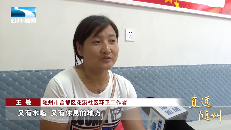 随州市曾都区花溪社区环卫工作者 王敏:“我们社区提供的这个场所挺好的,又有水喝又有休息的地方。”