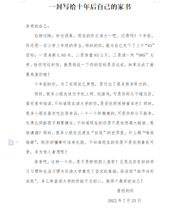 今天,“少年领读者·一封家书”编辑组收到了来自武汉市江夏区实验小学体育馆校区三(4)班郑品高同学写给十年后自己的一封信。