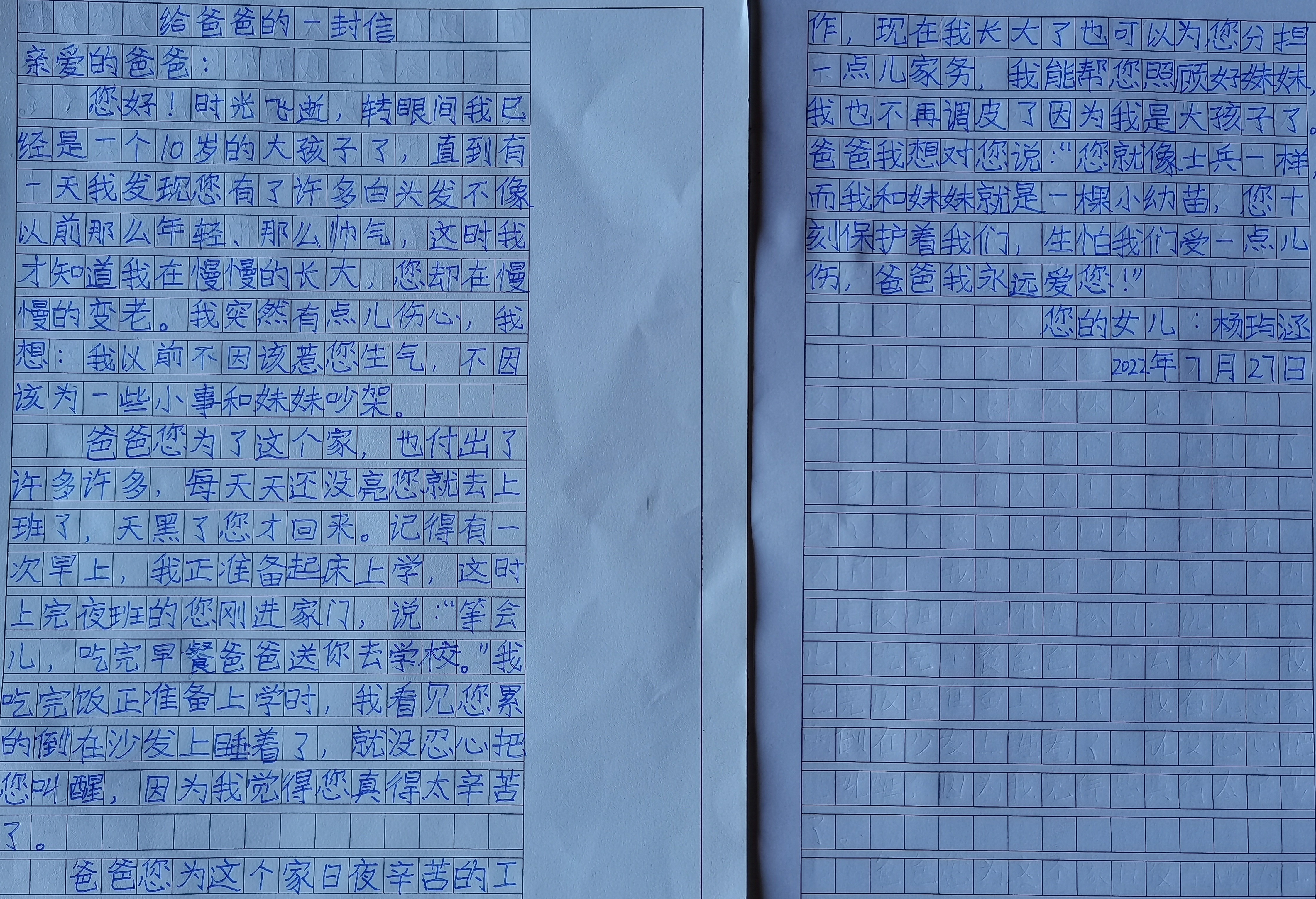 今天,“少年领读者·一封家书”编辑组收到了来自武汉市江夏区实验小学熊廷弼校区杨玙涵同学写给爸爸的一封信。