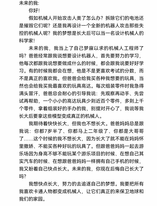 今天,“少年领读者·一封家书”编辑组收到了来自武汉市江夏区实验小学体育馆校区一(7)班舒骁睿同学写给未来的我的一封信。