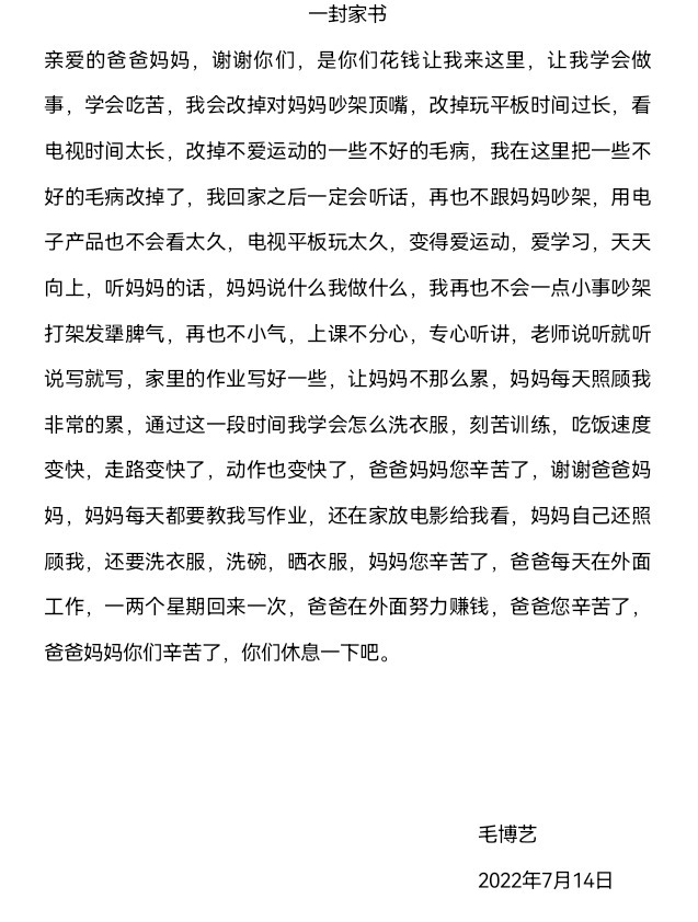今天,“少年领读者·一封家书”编辑组收到了来自武汉市江夏区实验小学毛博艺同学写给爸爸妈妈的一封家书。