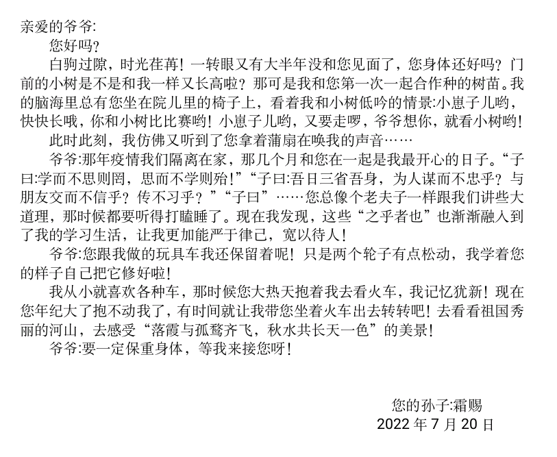 今天,“少年领读者·一封家书”编辑组收到了来自武汉市江夏区藏龙小学刘颜霜赐同学写给爷爷的一封家书。