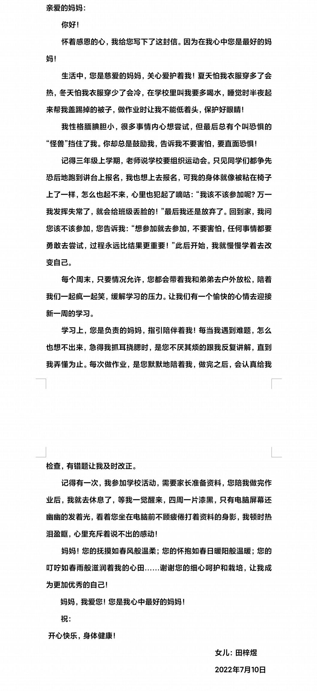 今天,“少年领读者·一封家书”编辑组收到了来自武汉市江夏实验小学体育馆校区田梓煜同学写给妈妈的一封信。