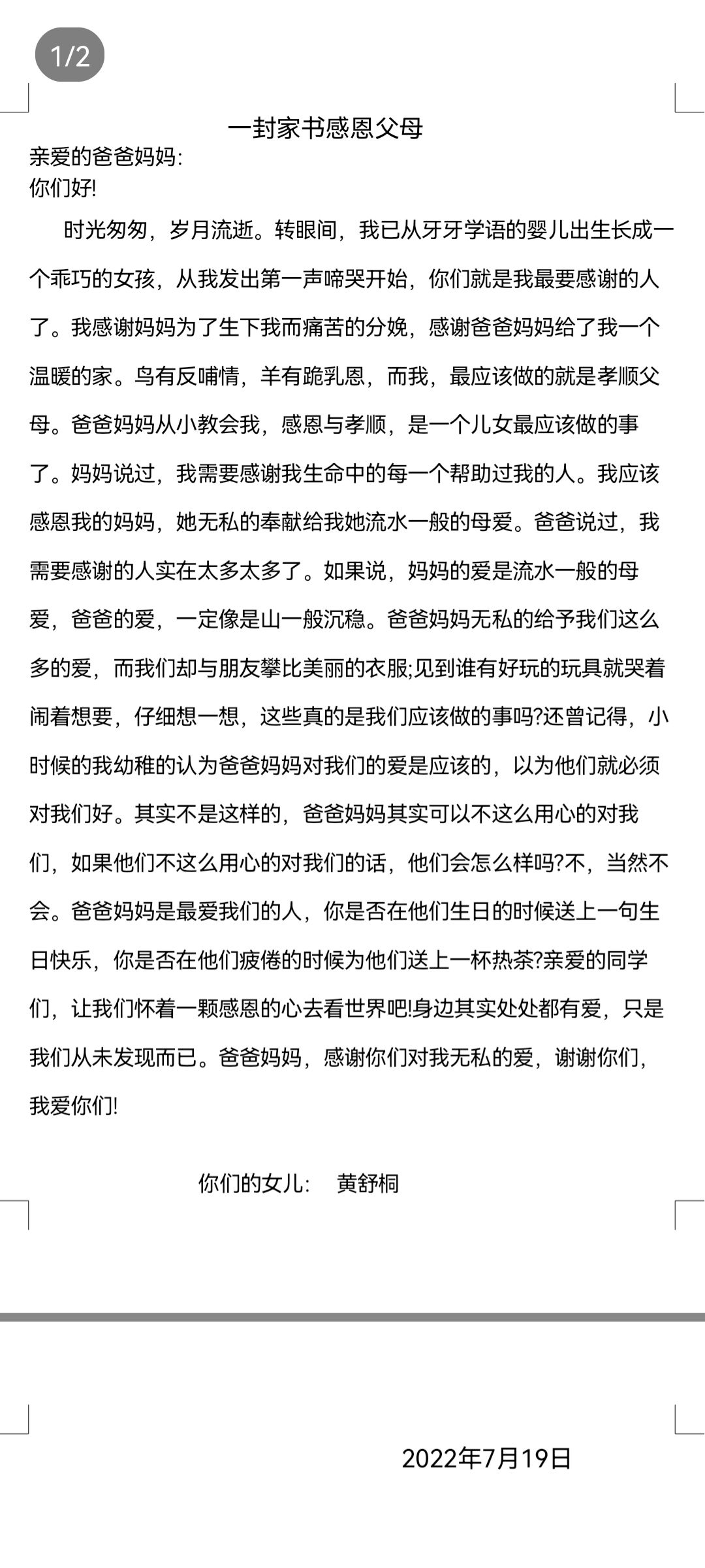 今天,“少年领读者·一封家书”编辑组收到了来自武汉市江夏区实验小学体育馆校区黄舒桐同学写给父母的一封家书。