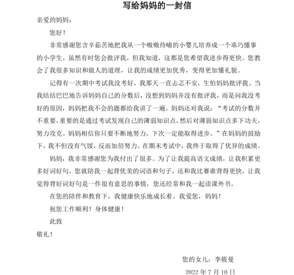 今天,“少年领读者·一封家书”编辑组收到了来自武汉市江夏区实验小学李筱曼同学写给妈妈的一封信。