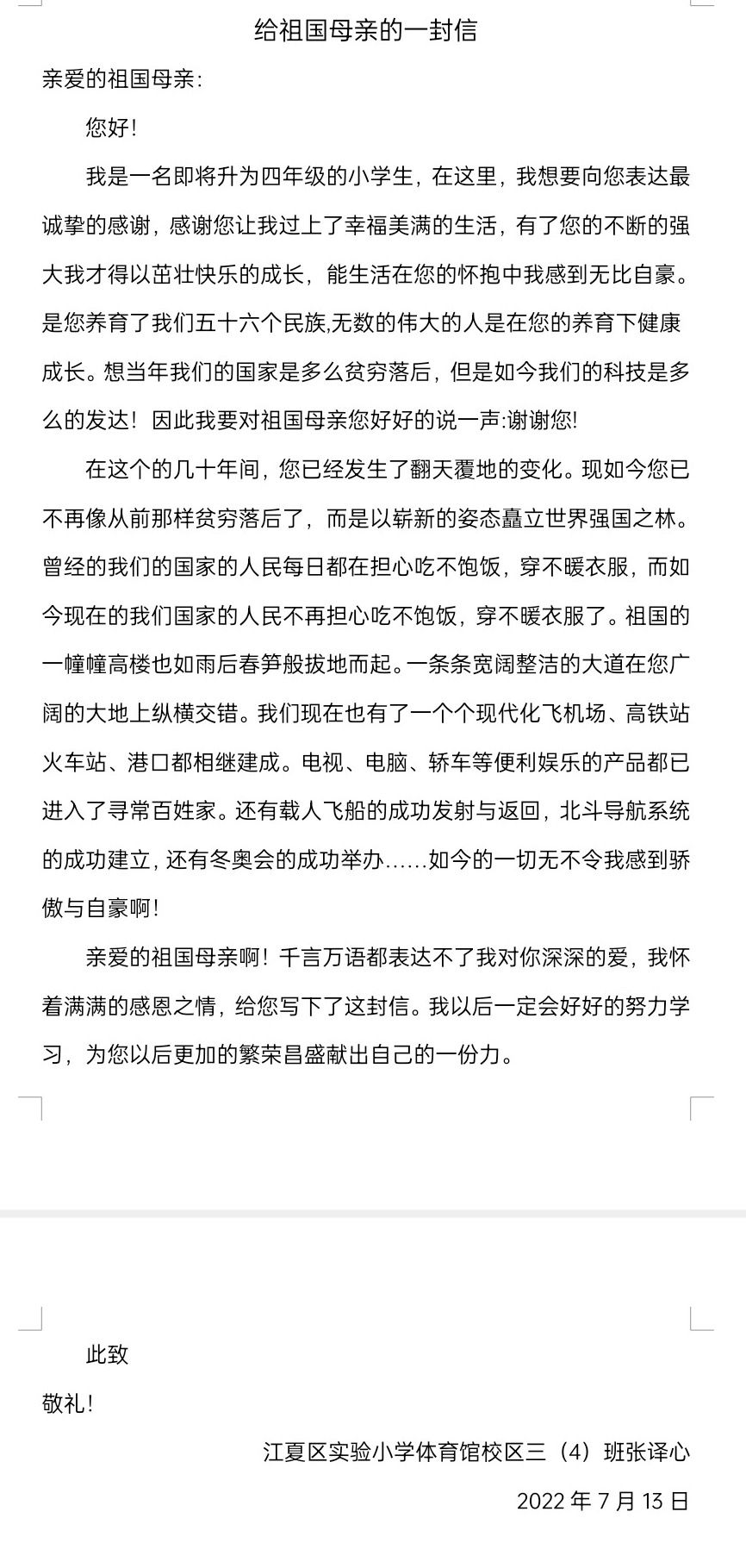 今天,“少年领读者·一封家书”编辑组收到了来自武汉市江夏区实验小学体育馆校区三(4)班张译心同学写给祖国母亲的一封信。