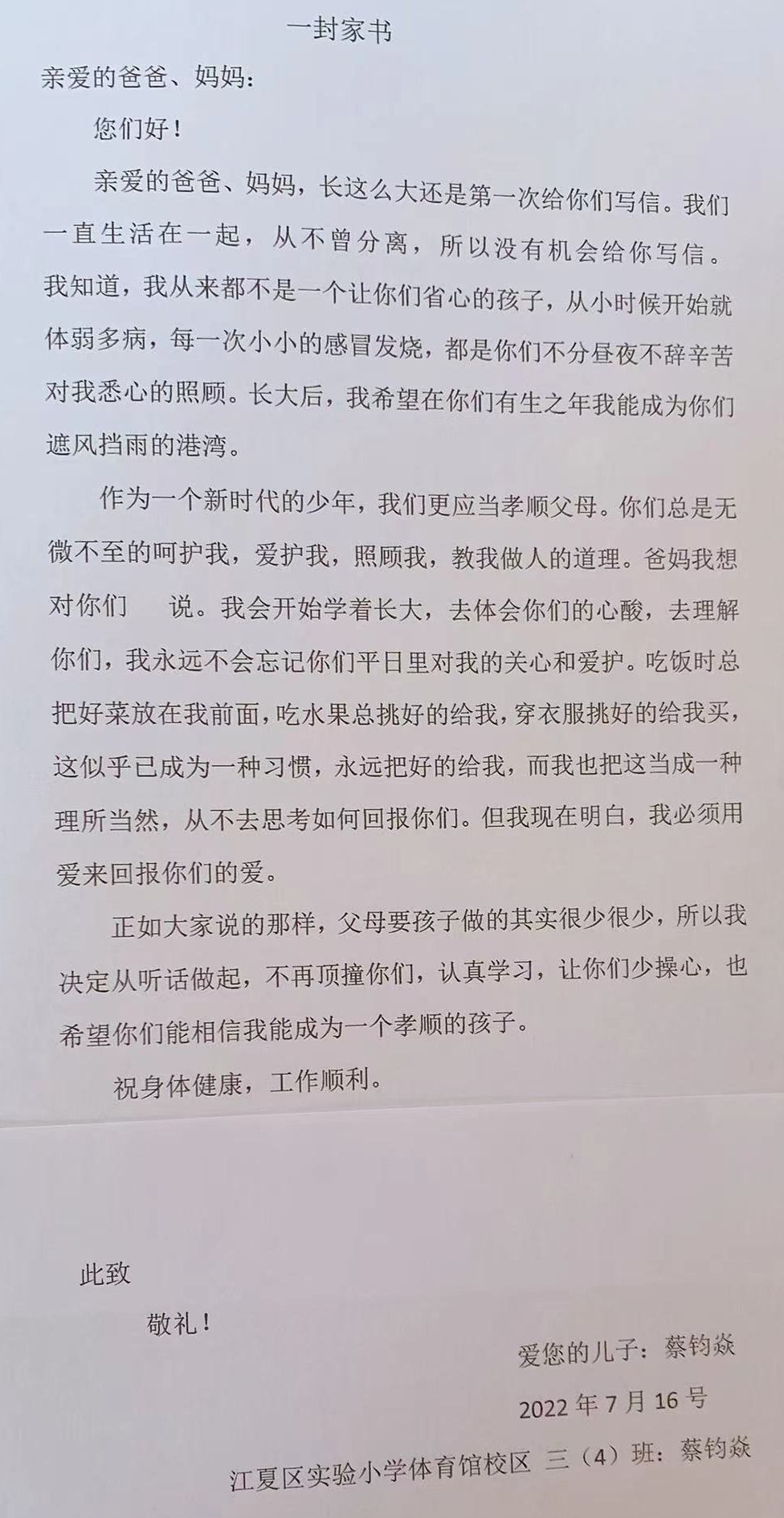 今天,“少年领读者·一封家书”编辑组收到了来自武汉市江夏区实验小学体育馆校区三(4)班蔡钧焱同学写给爸爸妈妈的一封家书。
