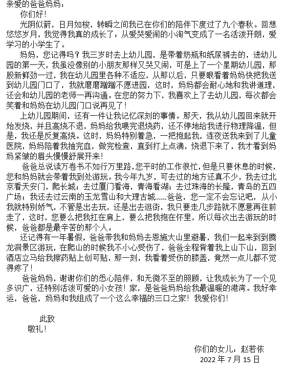 今天,“少年领读者·一封家书”编辑组收到了来自武汉市江夏区实验小学赵若依同学写给爸爸妈妈的一封信。