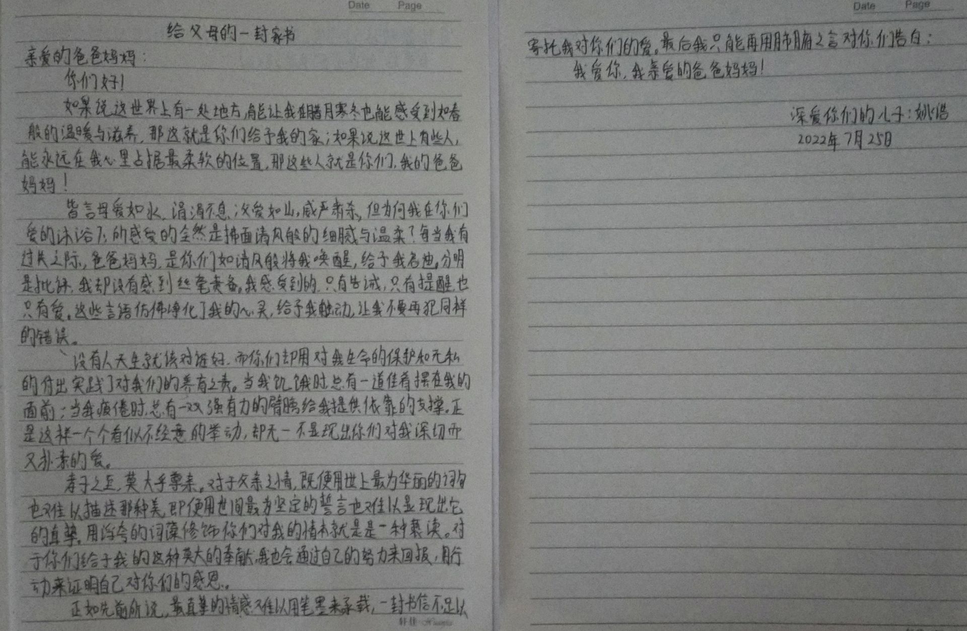 今天,“少年领读者·一封家书”编辑组收到了来自武汉市汉铁初级中学姚浩同学写给父母的一封家书。