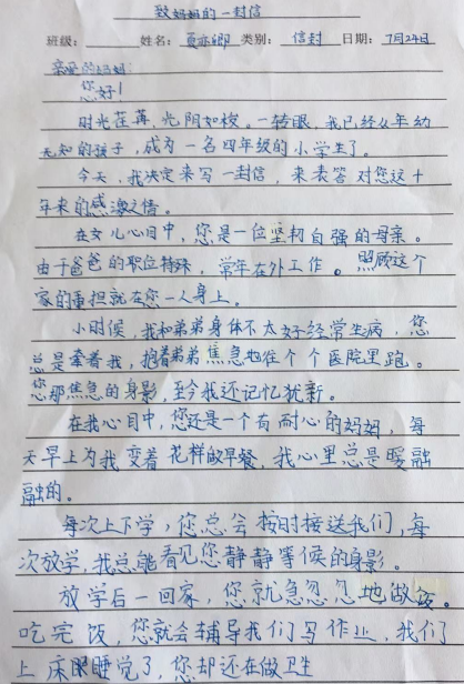 今天,“少年领读者·一封家书”编辑组收到了来自武汉市江夏区文化大道小学夏亦卿同学写给妈妈的一封信。