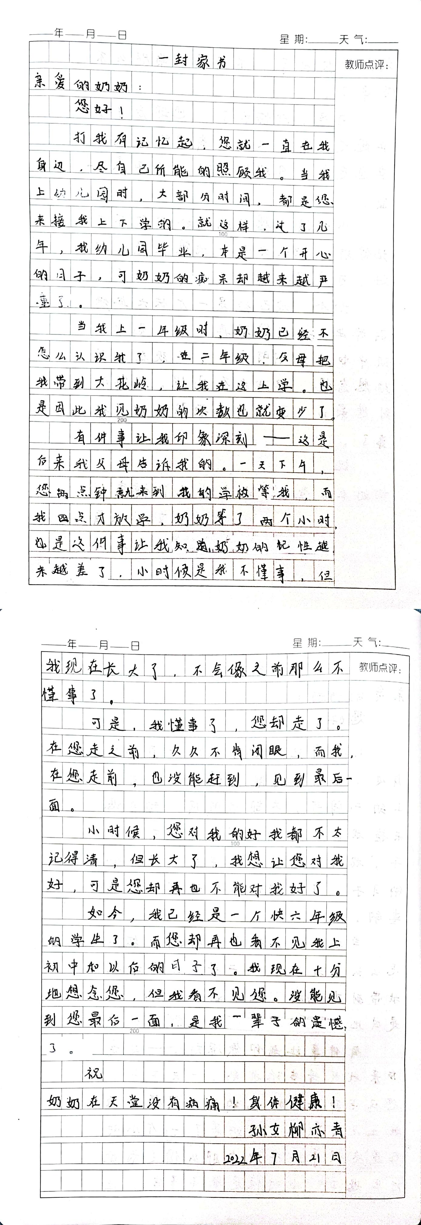 今天,“少年领读者·一封家书”编辑组收到了来自武汉市大花岭小学柳亦青同学写给奶奶的一封家书。
