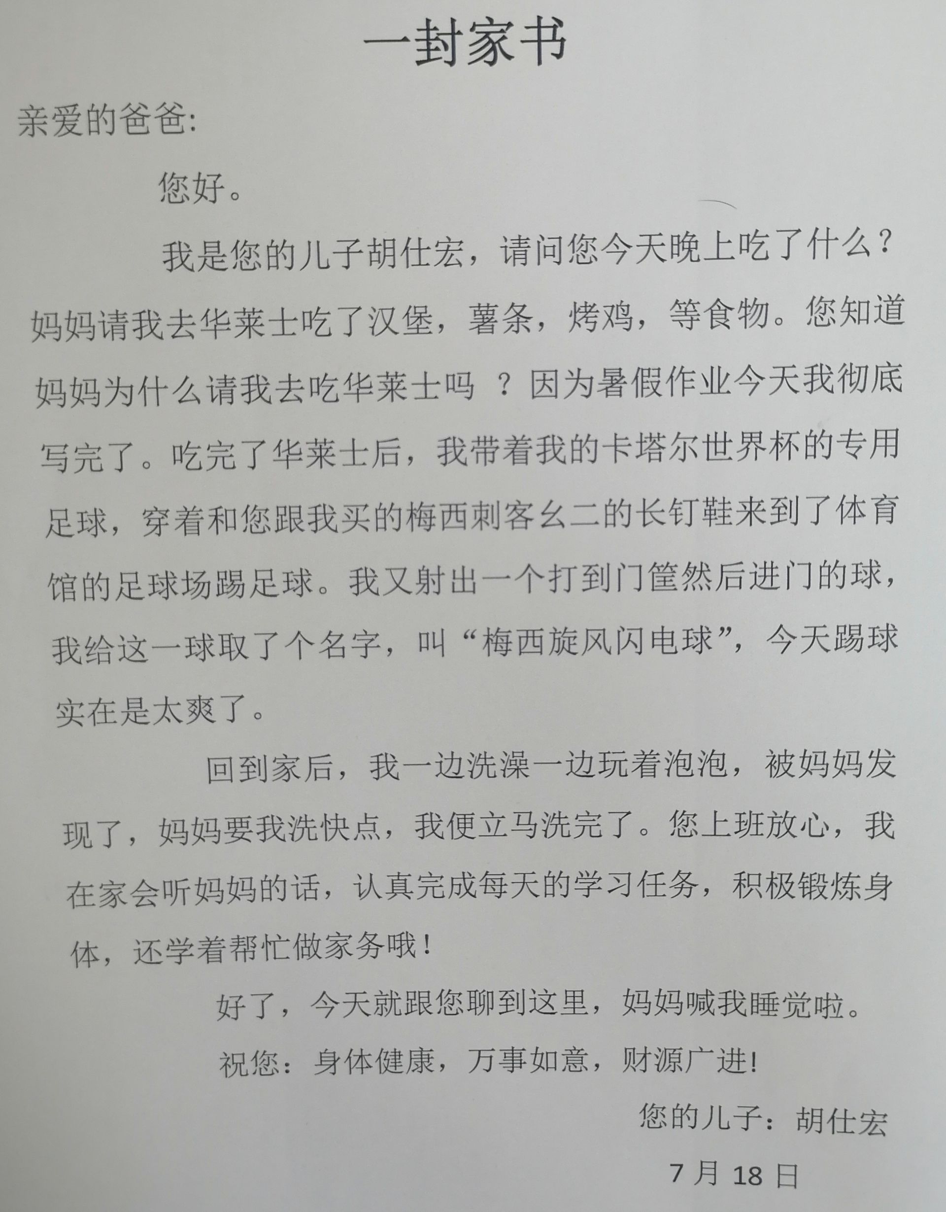 今天,“少年领读者·一封家书”编辑组收到了来自武汉市江夏区实验小学体育馆校区胡仕宏同学写给爸爸的一封家书。