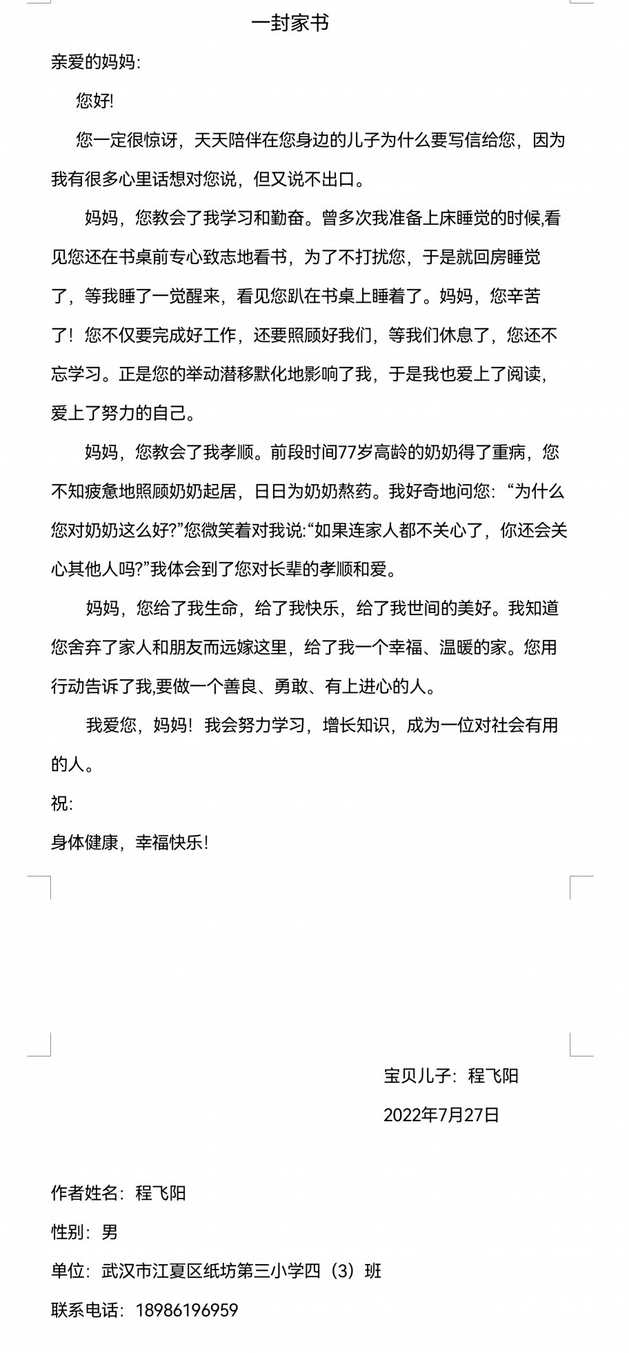 今天,“少年领读者·一封家书”编辑组收到了来自武汉市江夏区纸坊第三小学程飞阳同学写给妈妈的一封家书。