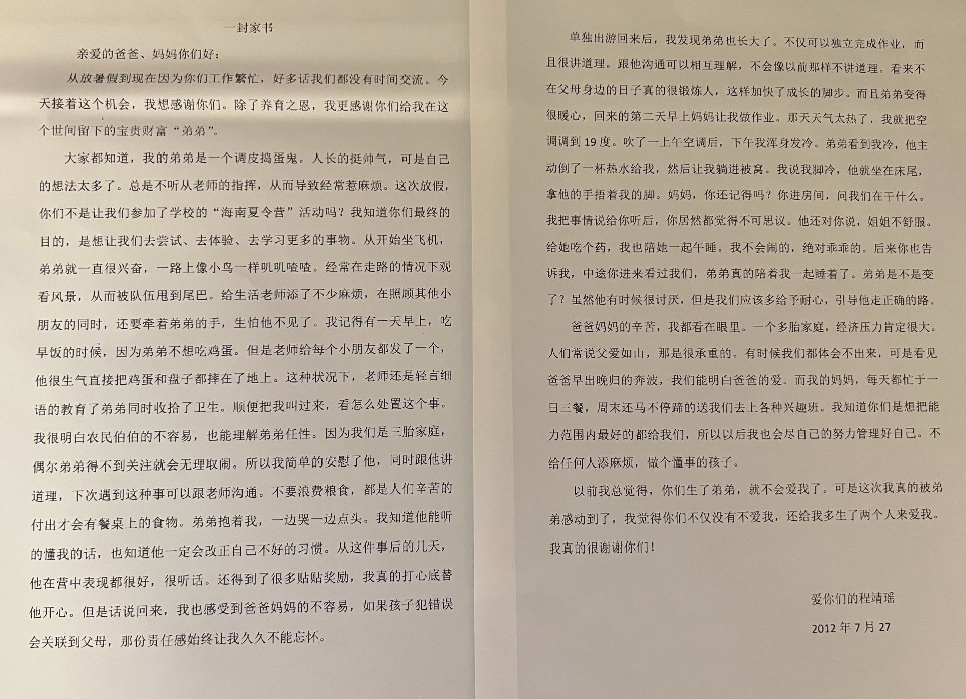 今天,“少年领读者·一封家书”编辑组收到了来自武汉市海淀外国语实验学校程靖瑶同学写给爸爸妈妈的一封家书。