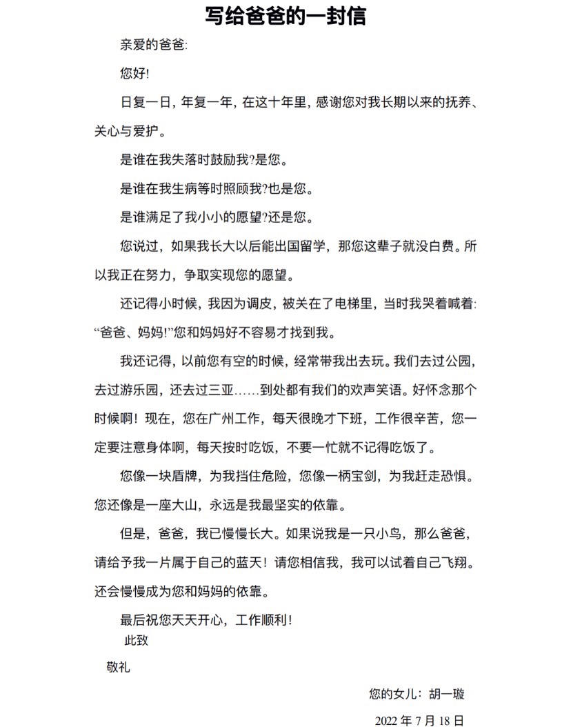 今天,“少年领读者·一封家书”编辑组收到了来自武汉市江夏区大花岭小学胡一璇同学写给爸爸的一封信。