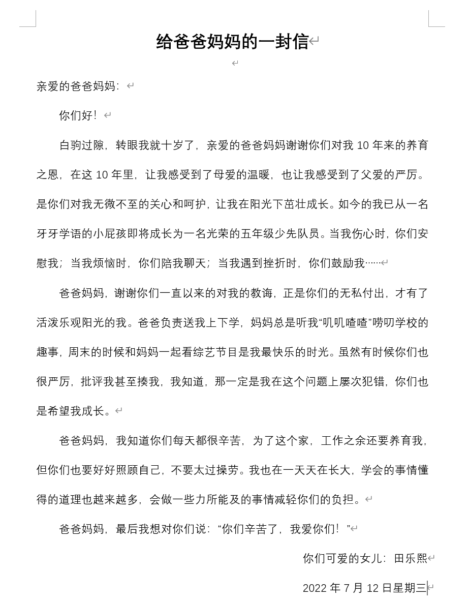 今天,“少年领读者·一封家书”编辑组收到了来自武汉市江夏区实验小学体育馆校区田乐熙同学写给爸爸妈妈的一封信。