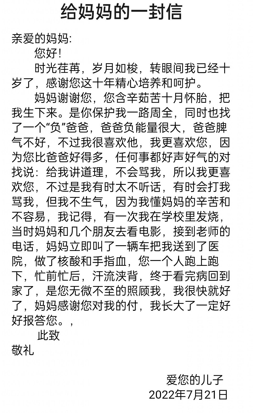 今天,“少年领读者·一封家书”编辑组收到了来自武汉市江夏区实验小学体育馆校区艾浩然同学写给妈妈的一封信。